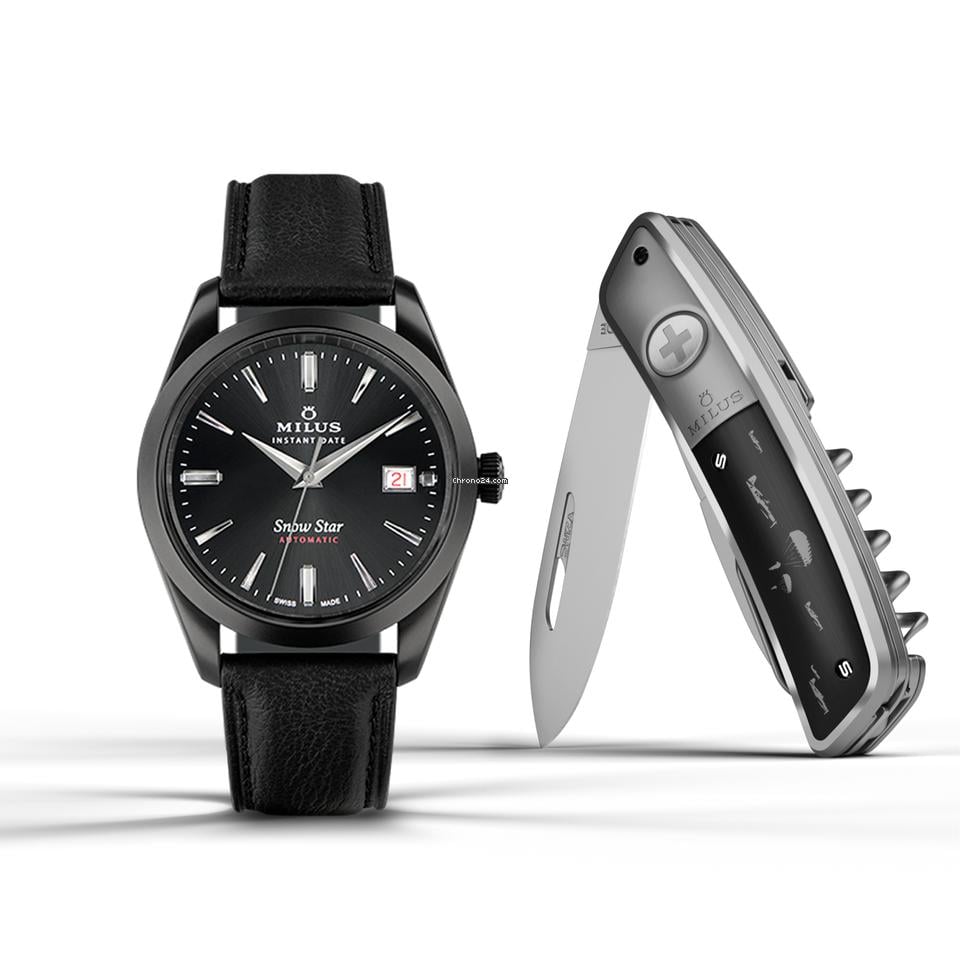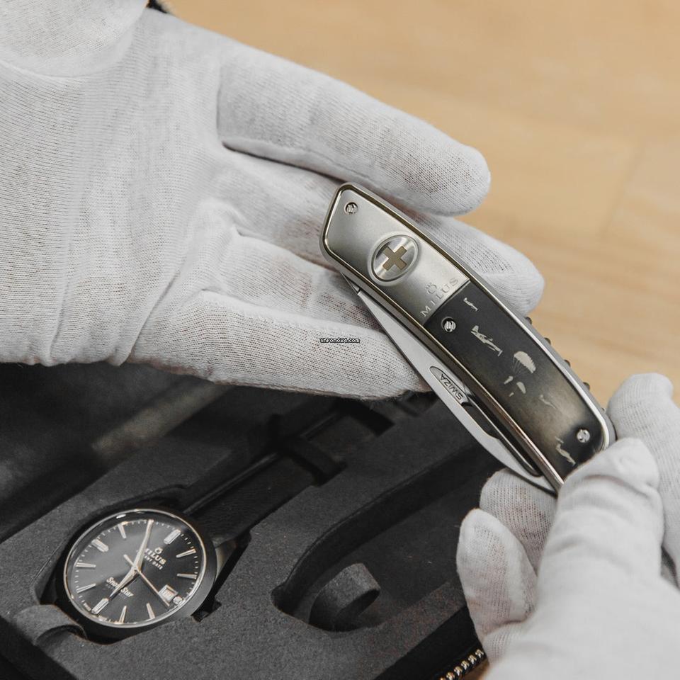 Inspired by the legendary Life Barter Kit carried by American pilots during Pacific missions, the Midway Edition – Dark Matter brings together two icons of Swiss design: the MILUS Snow Star and the SWIZA Legacies Knife. The Snow Star, a historically rooted tool watch, is paired with a custom-engineered SWIZA pocket knife featuring DLC-treated titanium and engraved aeronautical motifs.