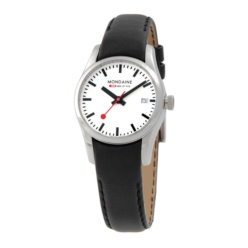Form and function blend harmoniously in this shaped Retro-style Mondaine watch. This timepiece comes with a 28mm polished stainless steel case. Its iconic white dial with Date window is covered by a curved sapphire crystal and it has a genuine leather strap with stitched.