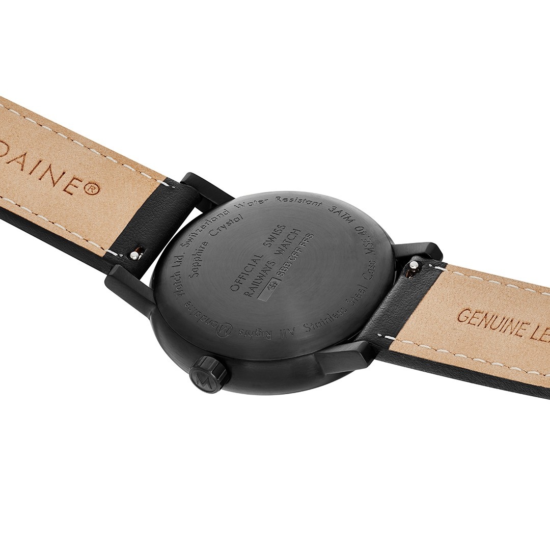 With its harmoniously designed 40mm IP black plated stainless steel case, this Mondaine watch is a real eye-catcher and very comfortable to wear. The black dial contrasts the white numerals, making this dial easy to read. The black leather strap completes the minimalistic design of this watch.