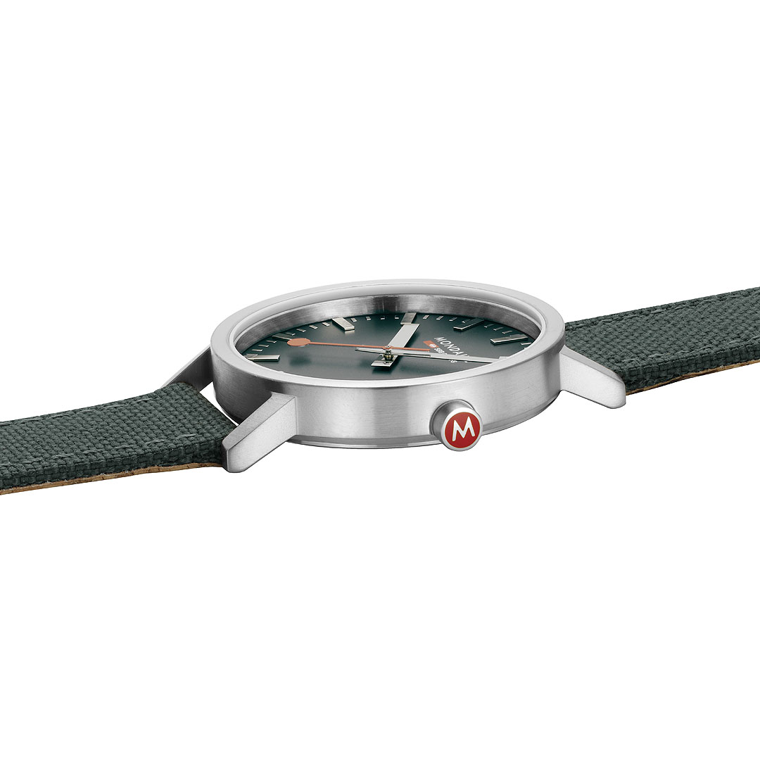 This Classic collection watch showcases a 40mm tone-on-tone stainless steel case, hands and markers with a matte finish to maintain the timeless design and minimalistic look of Mondaine. Featuring a Forest green dial and recycled PET textile strap with comfortable cork lining and stitches, this timepiece pays tribute to the beauty of our forests. Our Classic Collection comes with a clever quick-change system, allowing you to easily change your straps.
