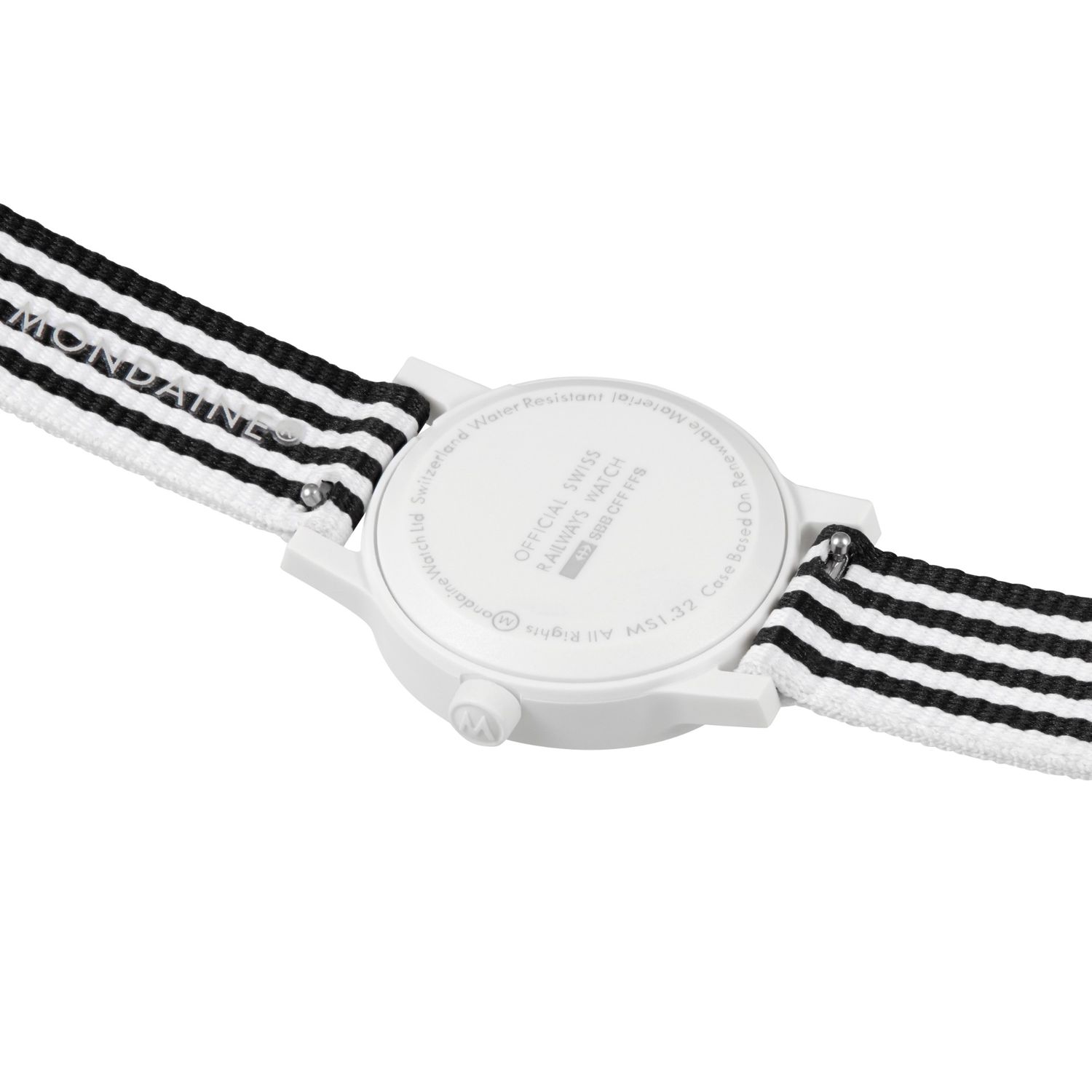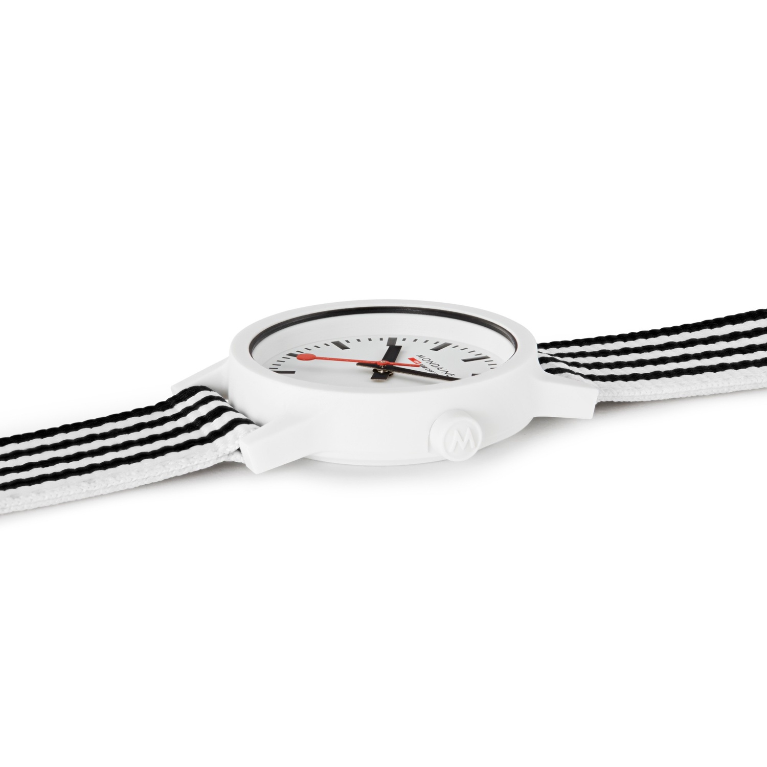 Developed using eco-friendly materials, this modern classic features a white dial with a Black & White striped textile strap. The 32mm case is made from castor oil compound, paired with a recycled textile strap, makes this watch entirely vegan. Together with the iconic dial and its red second hand it is a real eye-catcher on every wrist. Thanks to the innovative strap system, the strap can be changed in seconds, which can give the watch a completely new look.